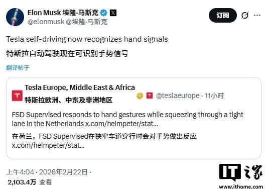 特斯拉首席执行官埃隆 · 马斯克随后通过个人社交账号转发该视频,并确认:“特斯拉自动驾驶系统现在可以识别手势信号。”