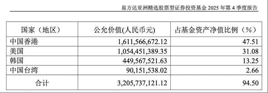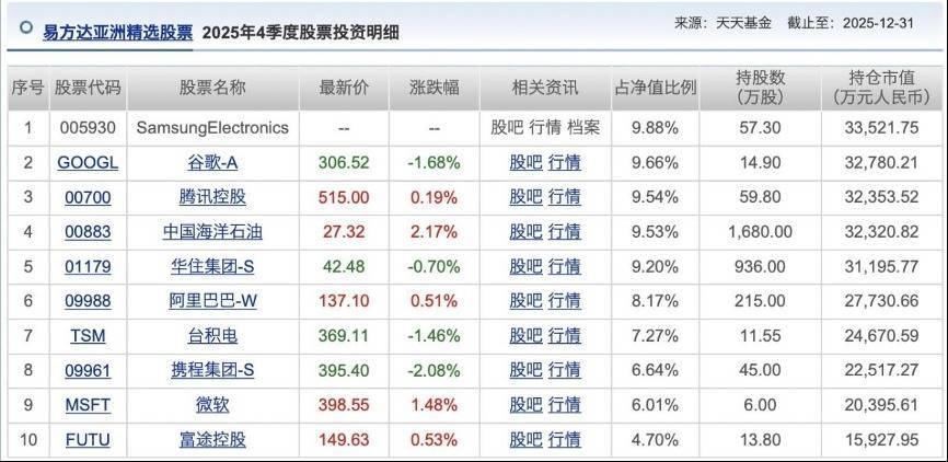 值得注意的是,去年四季度末,三星电子更是成为易方达亚洲精选股票的头号重仓股。2025年四季度末,该产品对三星电子的持仓比例达9.88%,与2025年三季度末的8.06%相比提升近2个百分点。