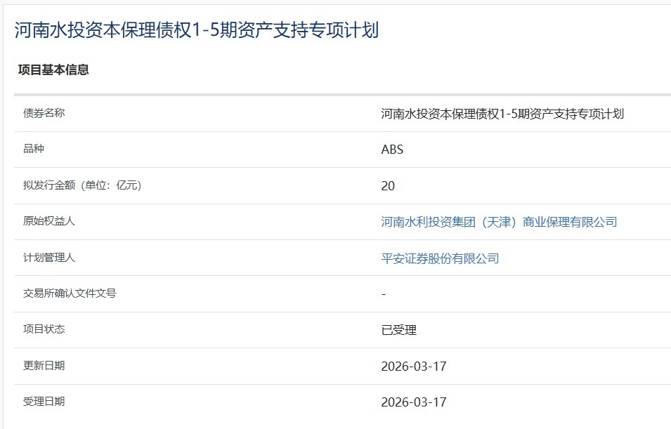 【大河财立方消息】3月17日股票配资开户会员, 河南水投资本保理债权1-5期资产支持专项计划项目获上交所受理。