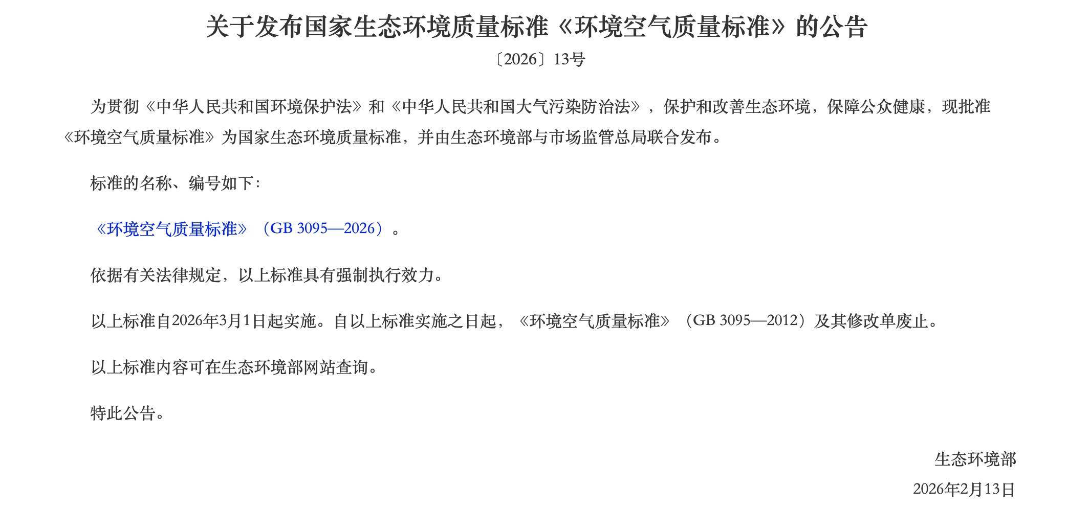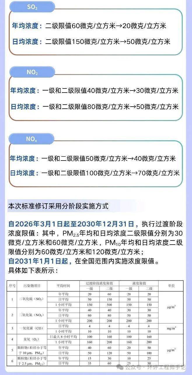 《环境空气质量标准》新增了日最大8小时平均、参比状态、参比方法、等效方法的术语和定义,调整了24小时平均的术语和定义;调整了环境空气功能区一类区范围;调整了颗粒物(粒径小于等于2.5μm)、颗粒物(粒径小于等于10μm)、二氧化硫、二氧化氮、氮氧化物的浓度限值;更新了污染物分析方法的要求;更新了实施与监督的要求。